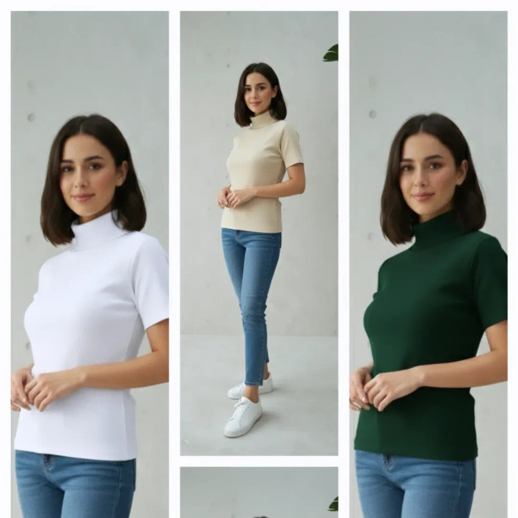 زیبایی در یک قاب یقه اسکی (استین کوتاه) با جنس کبریتی سوپر پنبه و در ۷ رنگ متفاوت.